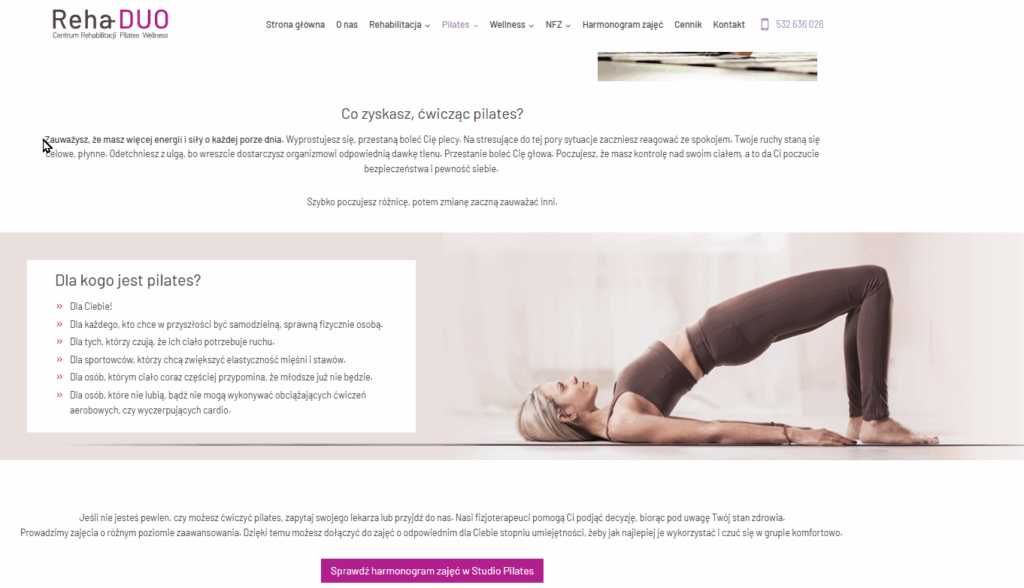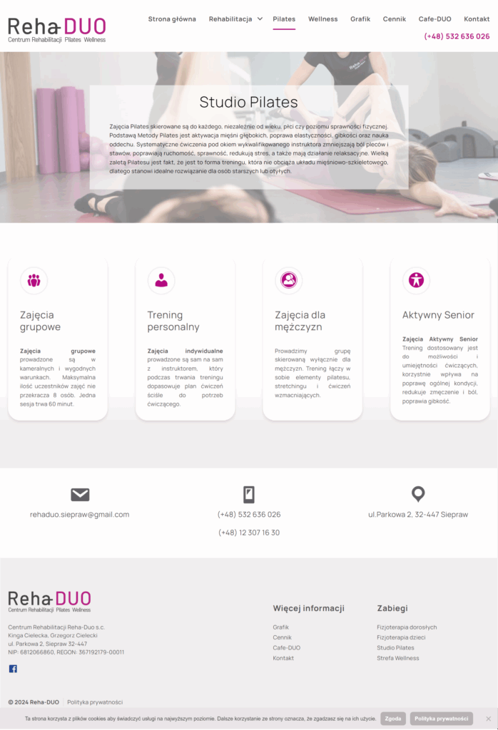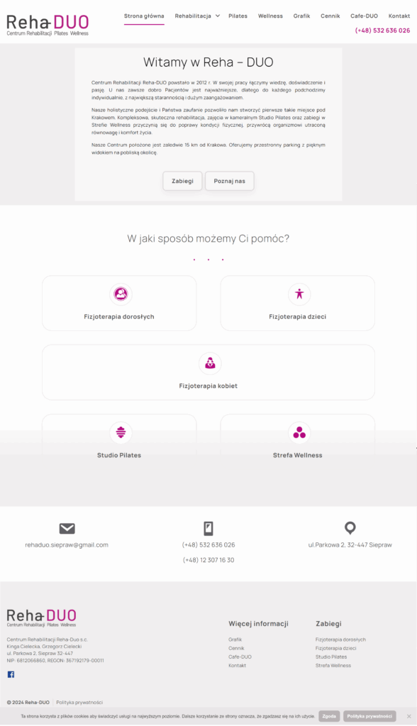 Pani Kinga poprosiła o stronę, na którą sama wejdzie z przyjemnością. Witrynę estetyczną, przytulną, funkcjonalną, która będzie odzwierciedleniem tego, co się dzieje w Centrum Reha-DUO. A dzieje się dużo: zajęcia pilates, masaże, promocje, warsztaty, zabiegi, ciągłe wychodzenie naprzeciw potrzebom pacjentów.