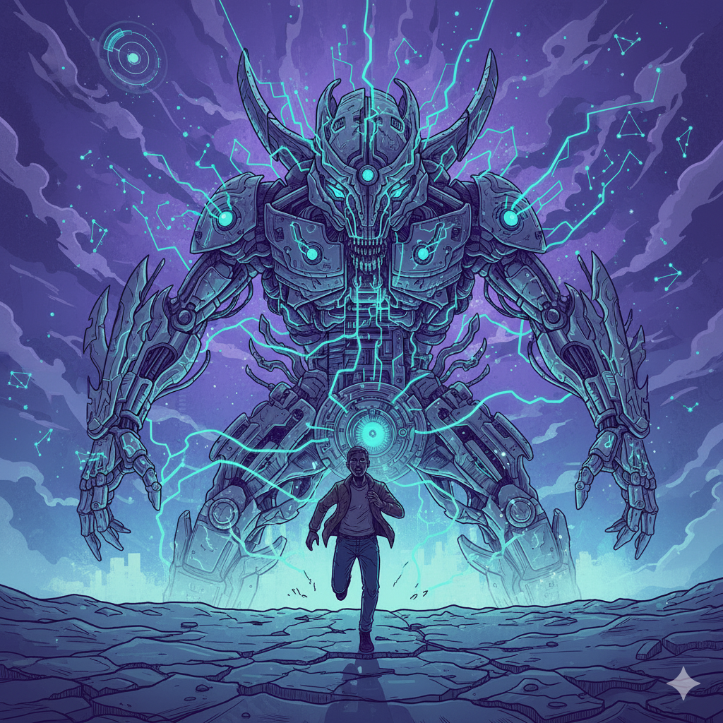 Człowiek uciekający przed AI, wygenerowany przez AI