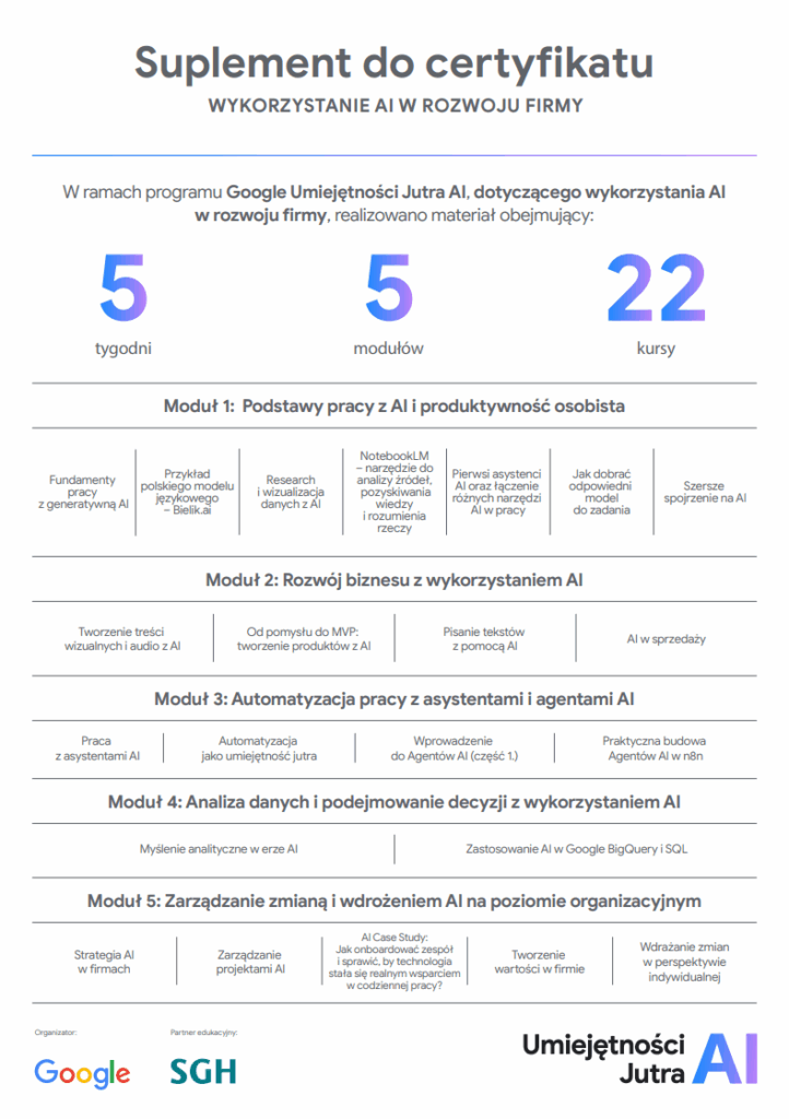 Program Umiejętności Jutra to pięciotygodniowe bezpłatne szkolenie stworzone przez Google i SGH. Skierowane jest do osób, które czują, że szybko wkraczający w nasze codzienne funkcjonowanie obszar AI może wspomóc rozwój ich produktywności w życiu i pracy, nie chcą dłużej ignorować sztucznej inteligencji, ale na razie nie bardzo wiedzą, jak ją wdrożyć, co wykorzystać, od czego zacząć. Także do tych, którzy z AI już trochę współpracują, ale chcą sprawdzić, co jeszcze potrafi. Co istotne landing page zgłoszeniowy wyraźnie zaznacza, że jest to nauka od podstaw, dla tych, którzy nie mają doświadczenia z AI lub są świadomi, że jest ono niewielkie. Podając dalej za tymże landingiem: